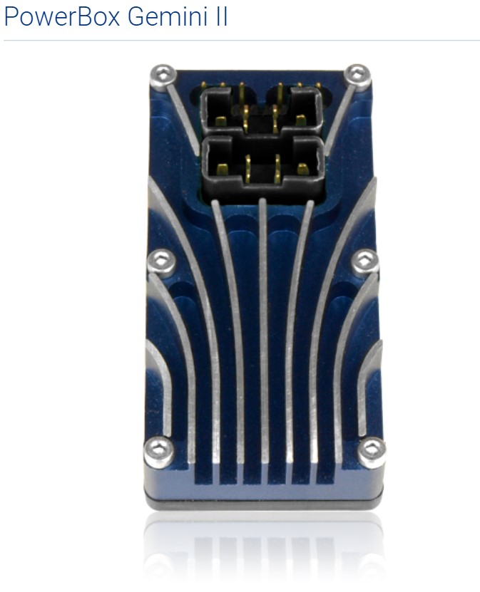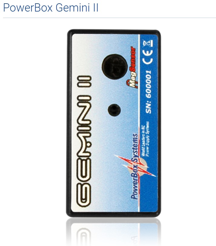 The Gemini II is the logical development of the PowerBox Gemini, which we have produced unchanged since 2005. The revised design incorporates ideas gleaned from customer requests and our own experience. The Gemini II has a considerably higher performance than the earlier model, since the case now consists of a high-quality machined aluminium heat-sink. Numerous supplementary features have also been added. For example, the pilot now has two options for activating the system: either by push-button using the SensorSwitch, or using a magnet. This also allows the implementation of a concealed installation; in this case an integral buzzer indicates the ON and OFF state. | Like all power supply systems from PowerBox-Systems, the Gemini II boasts consistent redundant construction: two regulators, two controllers and two integral Hall sensors ensure a totally reliable power supply. The external SensorSwitch activates both electronic switches simultaneously. The tri-colour LEDs in the SensorSwitch indicate the battery status in four stages. The battery inputs take the form of MPX high-current connectors. |