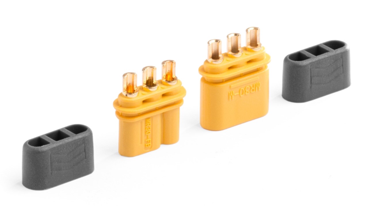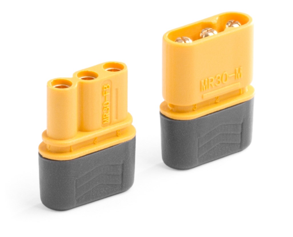 Three-pin power connector with gold-plated contacts with max. 30 A rating and cable covers.